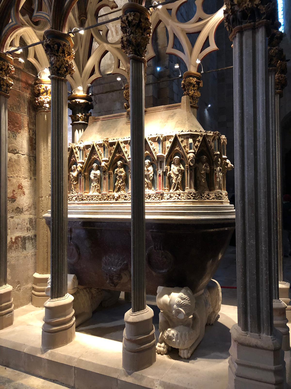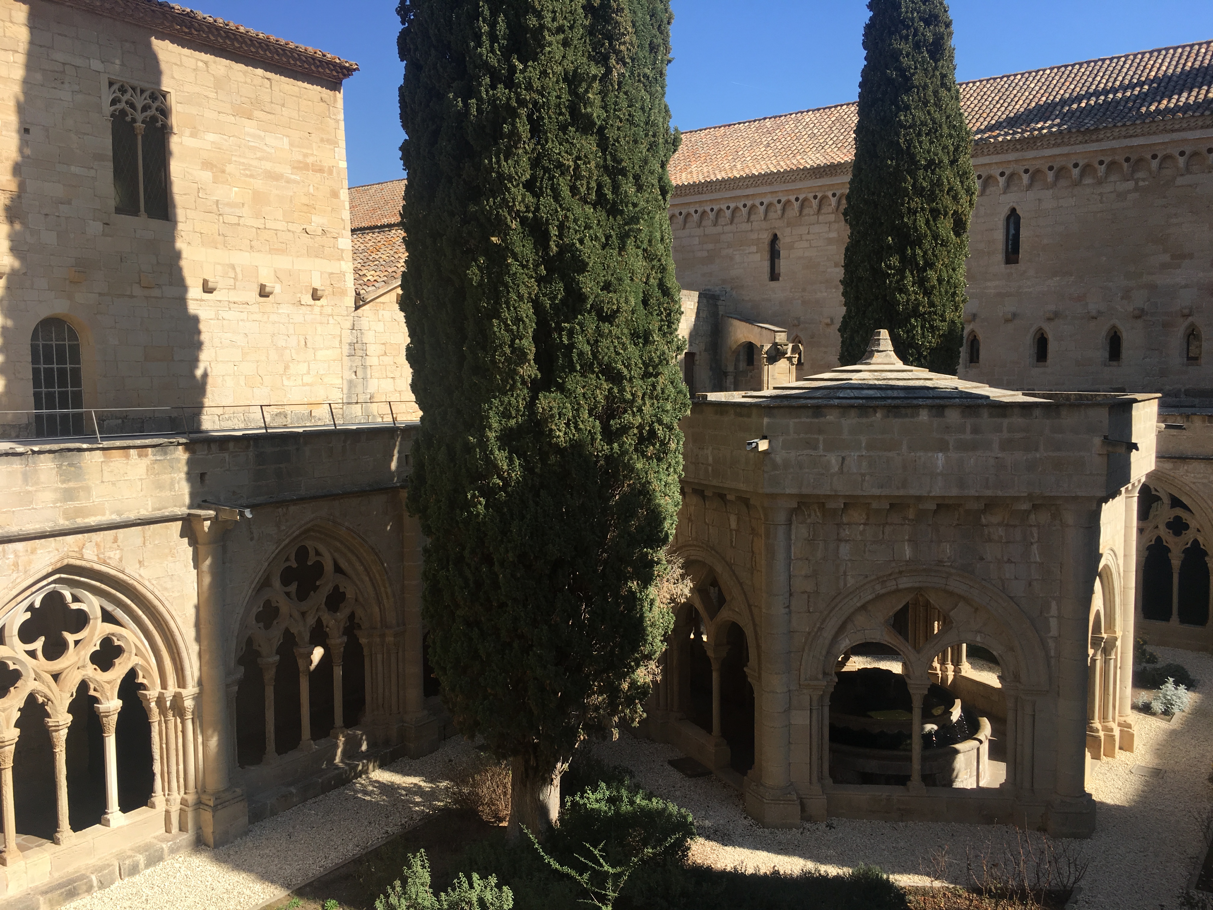 - Monasterio de las Santes Creus, Santes Creus, Tarragona. Se trata también de una abadía cisterciense, la realidad es que, ¡sus claustros y sus fuentes se parecen mucho! Data del siglo XII, la fundación del monasterio se remonta a 1150. Consta de una iglesia, con su hermoso claustro muy similar al del monasterio anterior, la sala capitular, refectorio, locutorio, sala de los monjes y en la segunda planta el dormitorio, un espacio abierto y muy austero que era común para todos. ¡Salid al exterior para disfrutar del impresionante rosetón! ¡Además cuenta con un palacio real! Mezcla detalles góticos, con barrocos y estilo románico y en su interior encontramos dos imponentes sepulcros, de nuevo pertenecientes a la dinastía del Reino de Aragón. El rey Pedro III de Aragón y su fiel almirante y el rey Jaime II de Aragón y su esposa. Precio de la entrada: 5,50 euros.